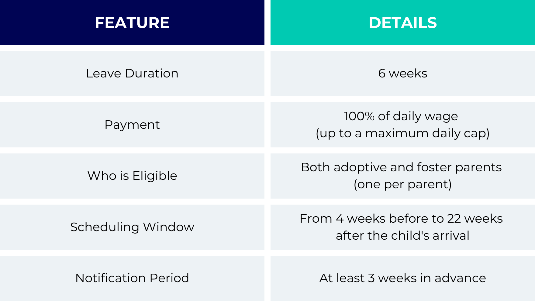 The following table summarises the key features of adoption and foster care leave in the Netherlands: